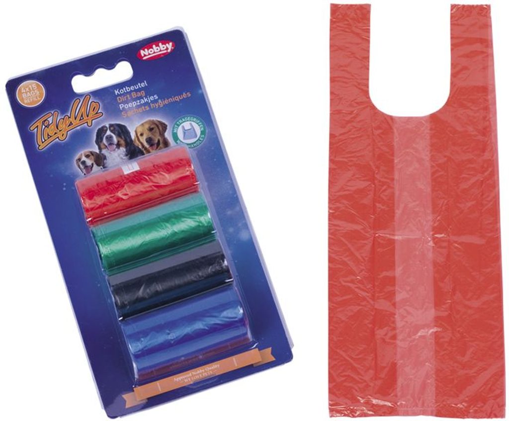 Pevné barevné sáčky s ušima. Balení obsahuje 4 ks rolí, kde 1 role má 15 ks sáčků.